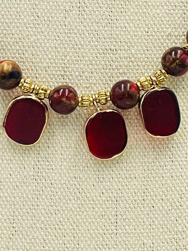 Collier de perles jaspe or rouge, rocaille à facettes noir