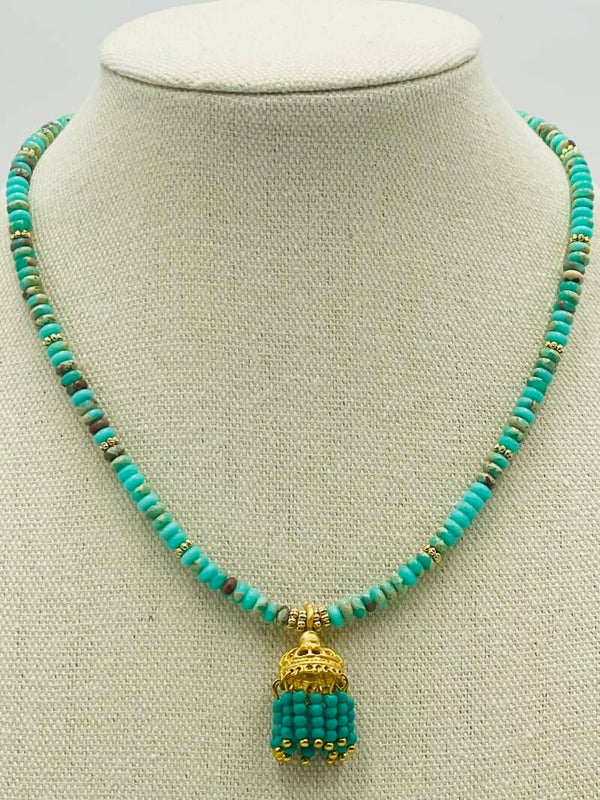 Pendentif pompon fait main, perles turquoise plaqué or
