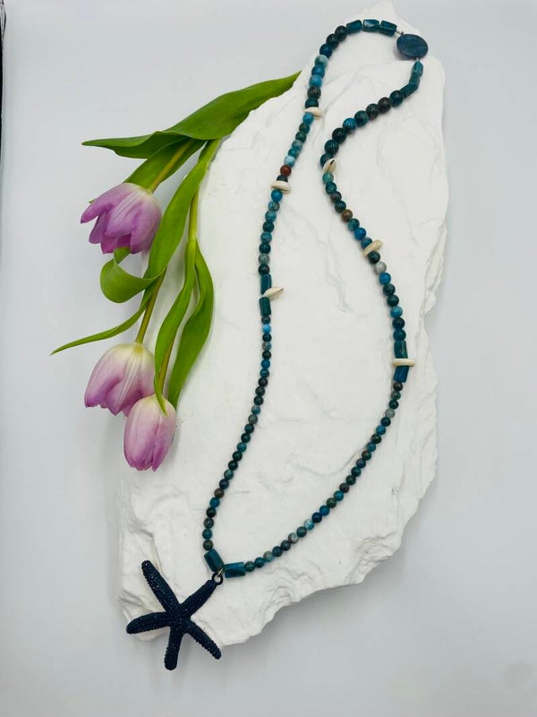 Sautoir perles pierre ronde, rectangulaire, apatite