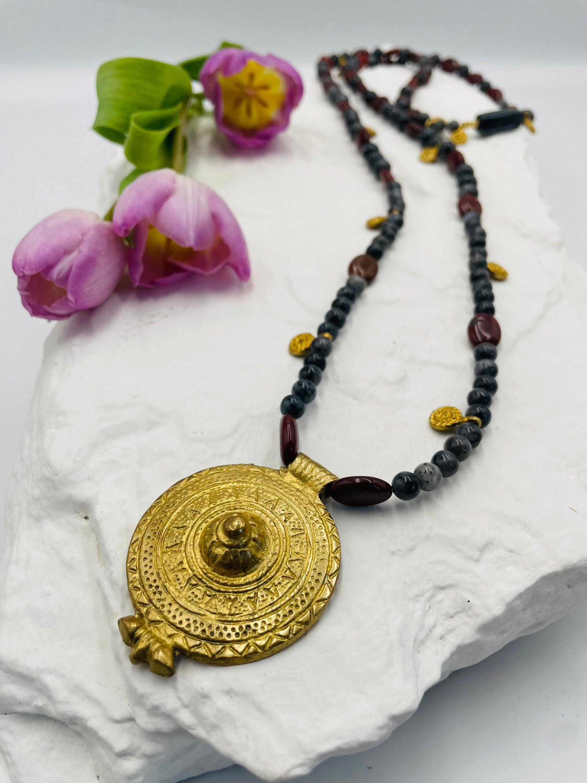Sautoir perles larkivite, jade rouge trinite