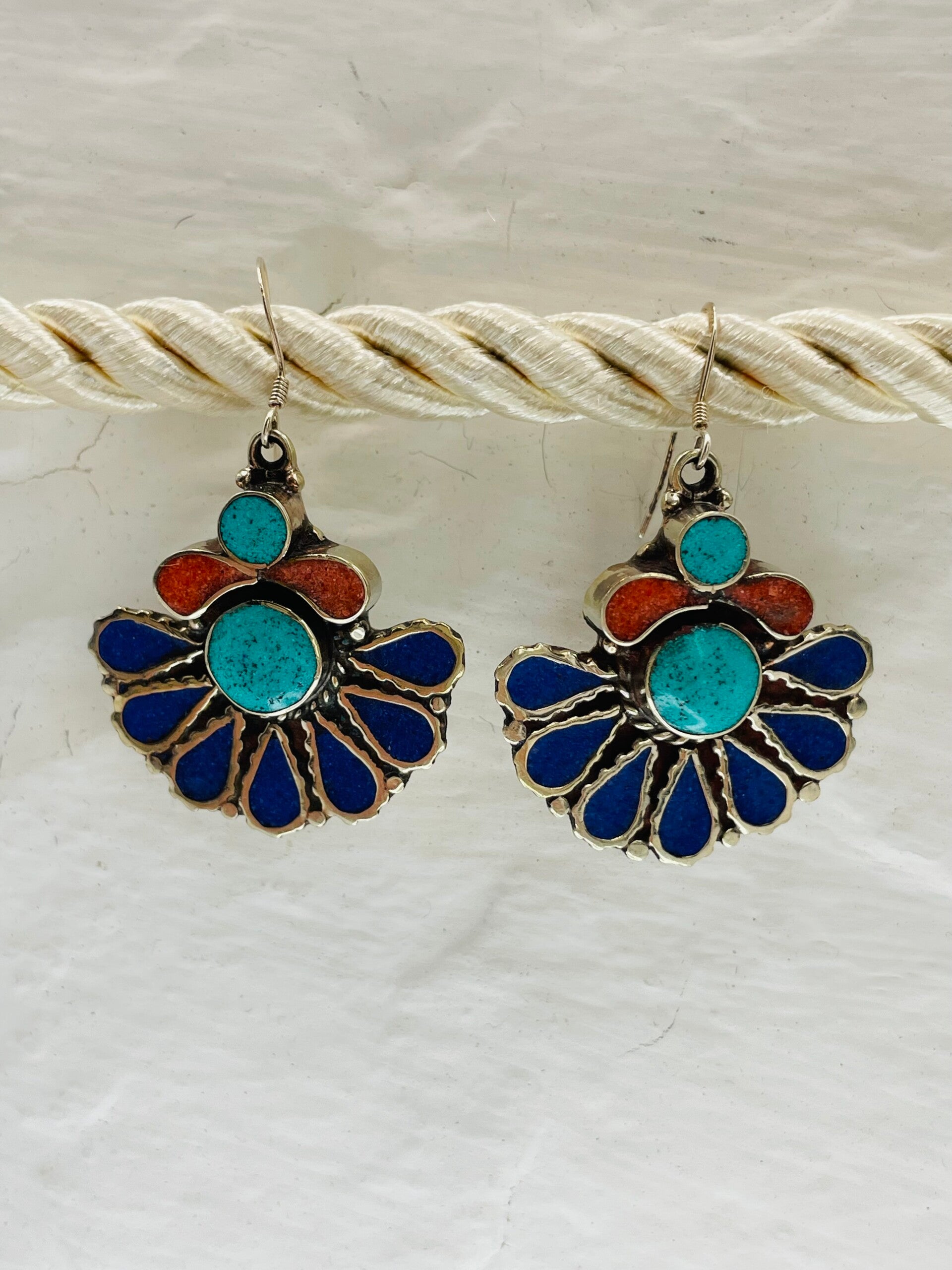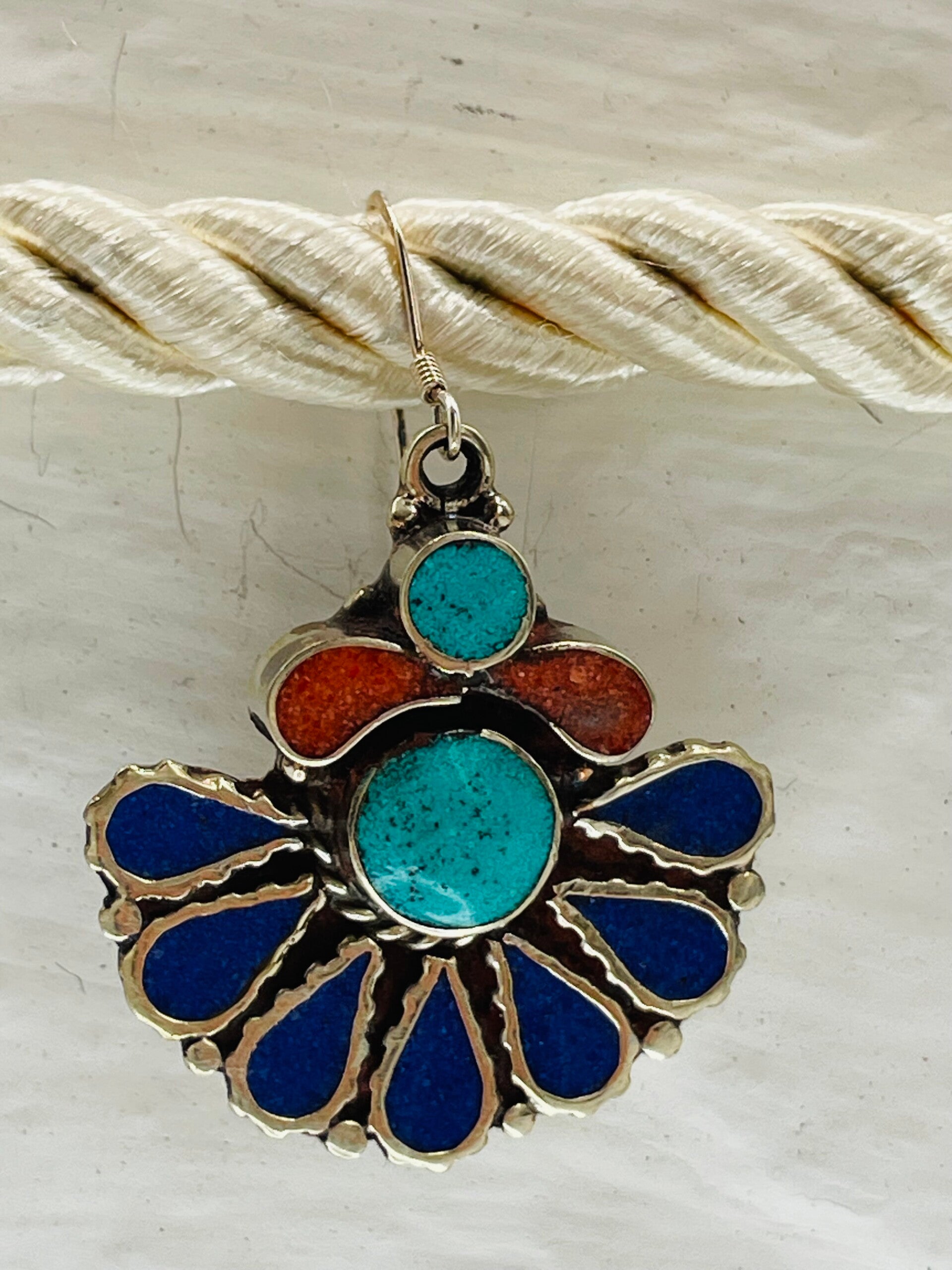 Boucle d'oreille fleur en pierre lapis lazuli, rond turquoise, calcite orange